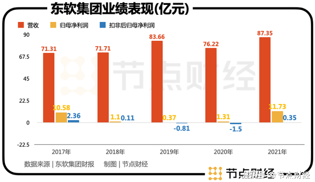 财报显示,2021年,东软集团实现营业收入87.36亿元,同比增长14.6%;归母净利润11.73亿元,同比增长794.35%。