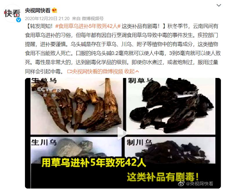 图片来自:新浪微博截图此前云南省疾控中心连续发表了3条提醒,强调不要用草乌这种药材进补。