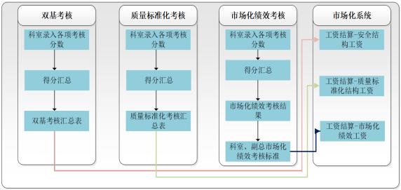 根据矿井当前的各类考核管理所涵盖的内容,如生产任务考核、双基考核、安全生产标准化考核、市场化成本考核、绩效考核、契约化考核等考核项目。通过各相关职能业务部门的打分及奖罚录入,得到全矿各部门的考核结果汇总数据,最终结果运用到矿井生产经营协同管控信息系统平台结算过程中。具体业务流程如下图: