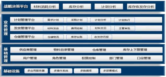 图4 物资系统功能架构图当有物资入库时,在物资管理系统填写收货单,并登记发票信息。当发票确认稽核后,向系统传递物资的入库信息。同时,各单位的需求计划汇总及物资领用申请,由物资管理系统实现月度需求计划的填报、审批、汇总,以及物资领料申请的填报、审批、出库确认等操作,并向主数据平台发送需求计划汇总数据及物资领用出库信息。由系统进行读取汇总的需求计划和领料出库数据,从而方便采购和领料。