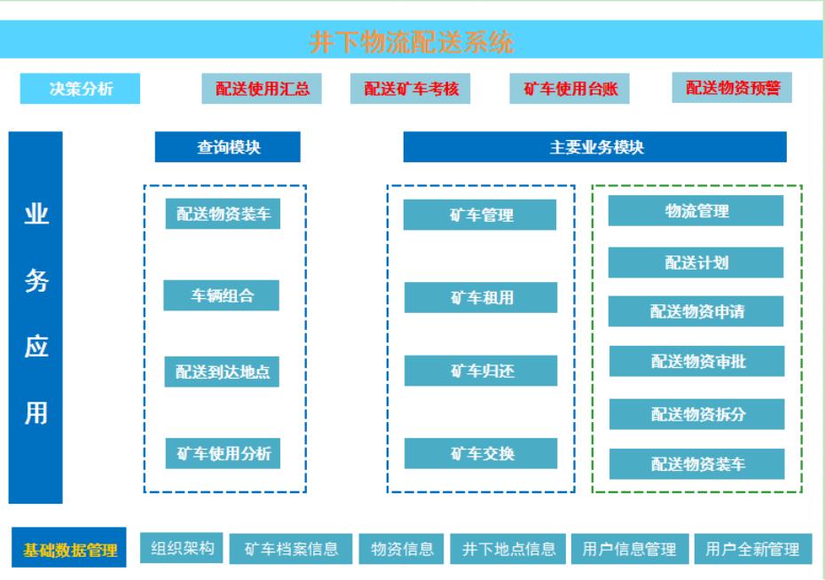 井下物流配送管理子系统通过矿车的申请、配送物资的申请、物料装车编组下井后,通过矿车的领用、归还和移交功能对非配送矿车进行流动管理,实现矿内全部矿车(包含非配送矿车)、全部配送物资的统一管理,月底对全矿矿车的使用情况进行统一考核与核算。
