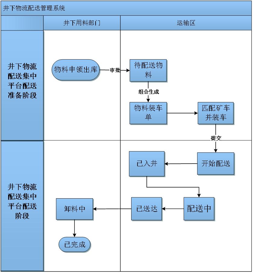 用料单位提前一天将需要配送下井的物资进行申请出库,申请单包括领料部门、材料名称、数量、配送地点、配送时间等信息。经过相关人员审批确认后进行物资发放,确认发放的领料单会自定进入配送物料装车模块。