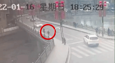 2022年1月16日,四川乐山,一辆白色轿车在某桥梁路段行驶时,与一名突然横穿马路的小女孩发生碰撞,造成女孩受伤。视频监控显示,事发时,小女孩在马路沿上蹦蹦跳跳,突然加速横穿公路,直接撞上了正常行驶的白色轿车。