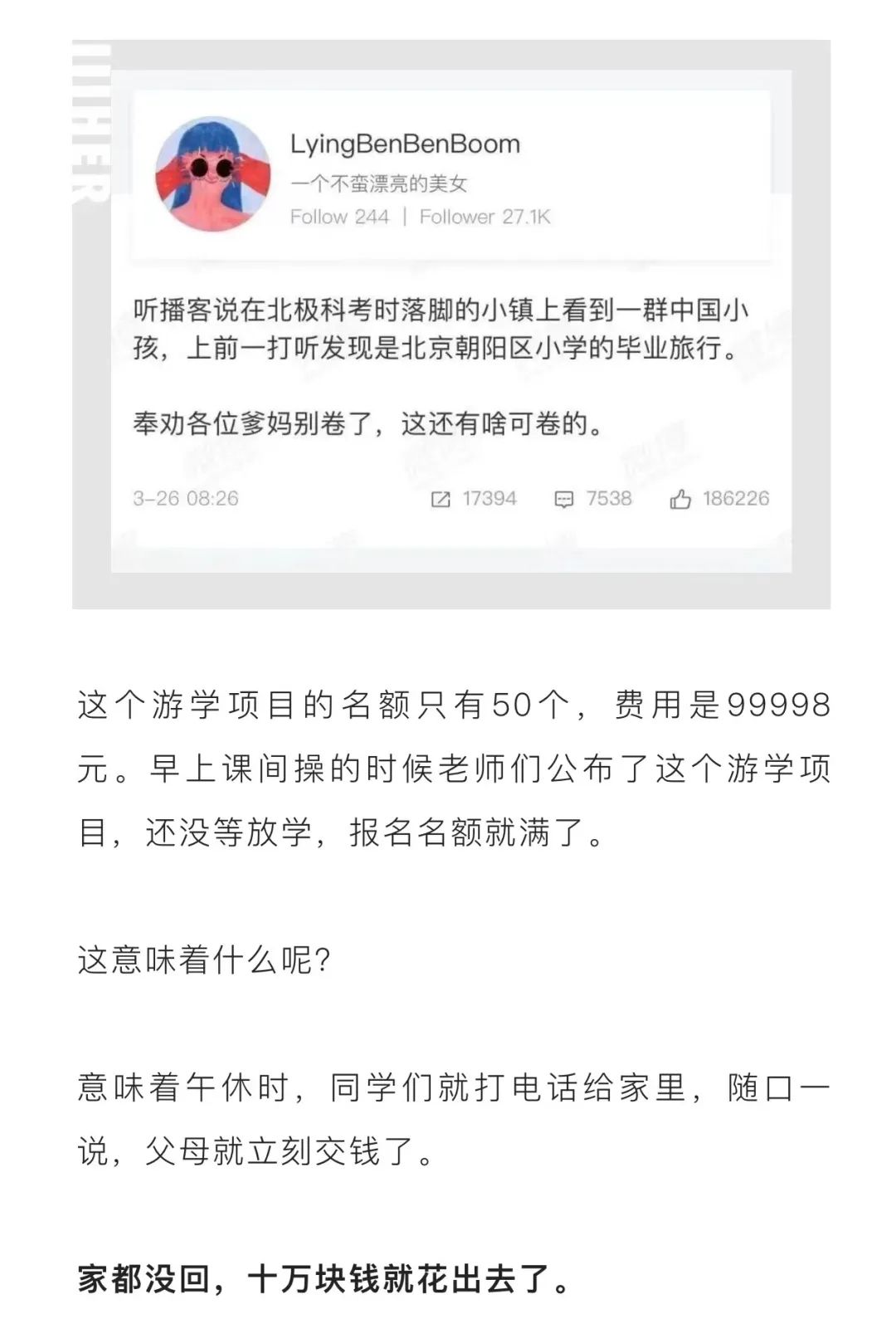 曾有博主爆出在北极科考落脚小镇时看到一群中国小孩,上前一打听发现是北京朝阳区小学生毕业旅行。