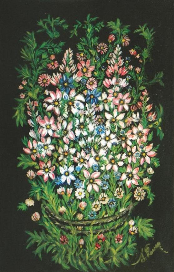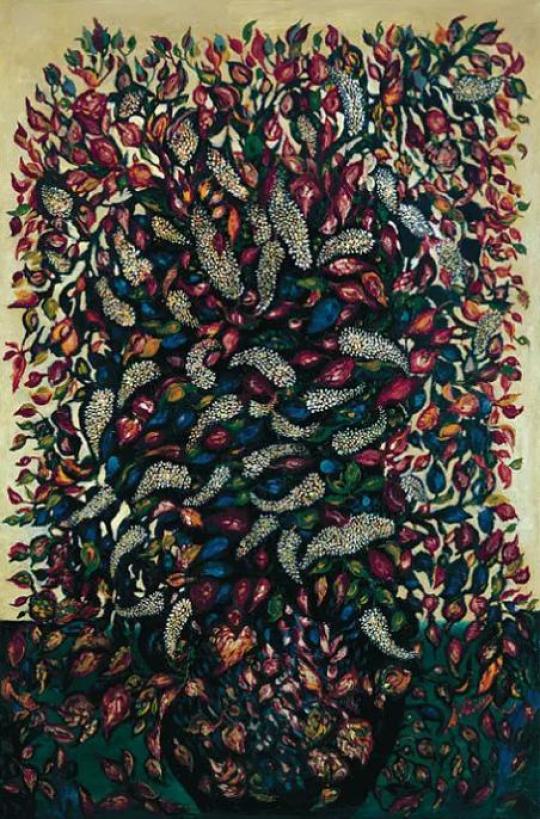 萨贺芬作品画面绘制的依然是她最熟悉的自然风光、植物昆虫、水果花朵。