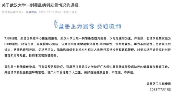7月11日,武汉市武昌区卫生健康局发布通报:武汉大学出现1例感染性腹泻病例,经检查诊断为霍乱。