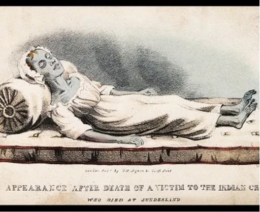 图注:一副当年反应霍乱患者皮肤发蓝的插画(图片来源:John William Gear )