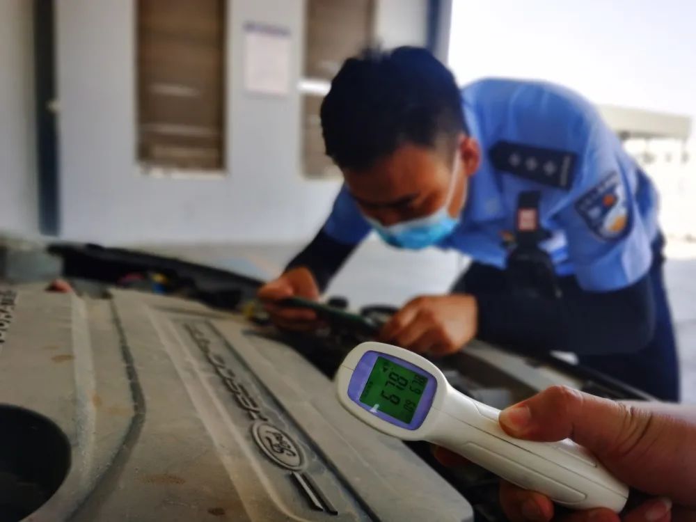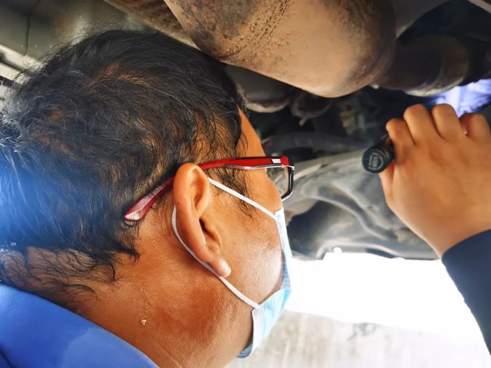 设在户外的车管所查验场地虽说有顶棚,却挡不住扑面而来的滚滚热浪,尤其是靠近发动机仓查验时,就如同靠近一个大火炉。由于天气比较炎热,在等候查验的车主都启动着车辆,开着空调,当车辆停下熄火后,查验民警们需要打开滚烫的引擎盖。在车辆引擎盖打开时,瞬间热浪扑面而来,像是刚揭开沸水锅盖冲出来的水蒸汽,车辆机舱内的温度此时能达到60多度。为了保证业务及时办结,查验民警顶着热浪钻入引擎盖下,透过被油污和锈迹覆盖的组件查找发动机号和车架号。不出一分钟,就汗流浃背,汗珠顺着脸庞滚落,警服也一遍遍被汗湿。