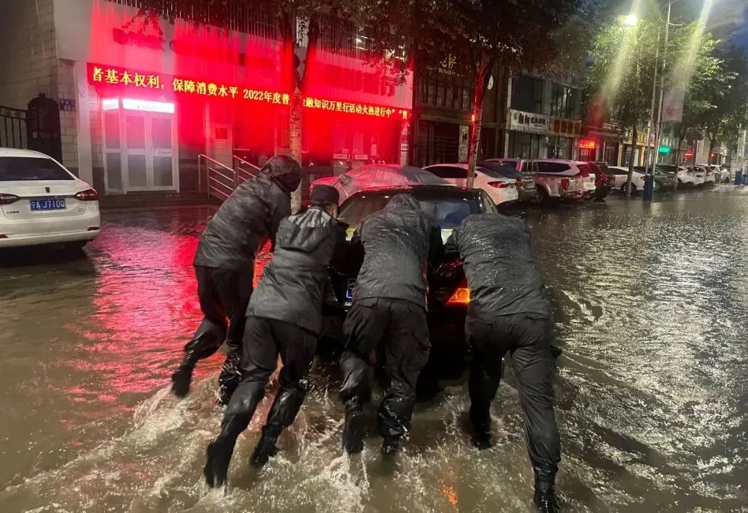 民警冒雨将涉水车辆推到路边安全区域等待救援,同时队员们在该区域定点值守,对来往车辆进行疏导,避免车辆驶入积水区域。#