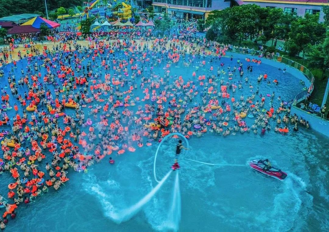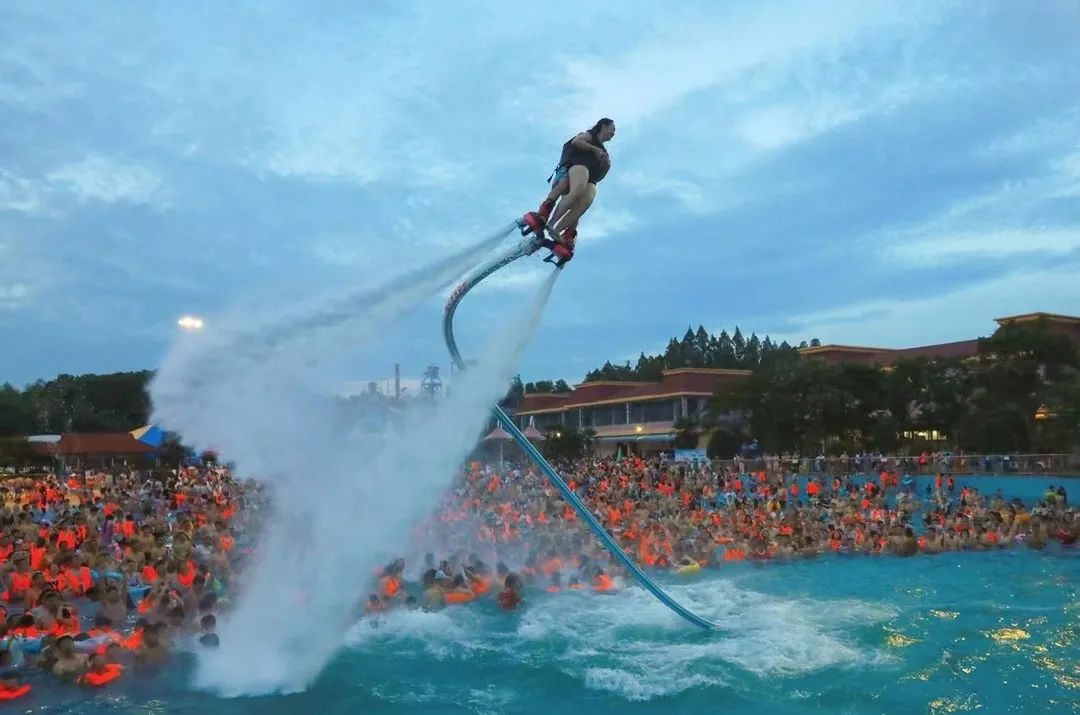 游客们争相体验刺激的水上飞人表演,配上动感音乐,水中蹦迪,让您感受夏日激情。