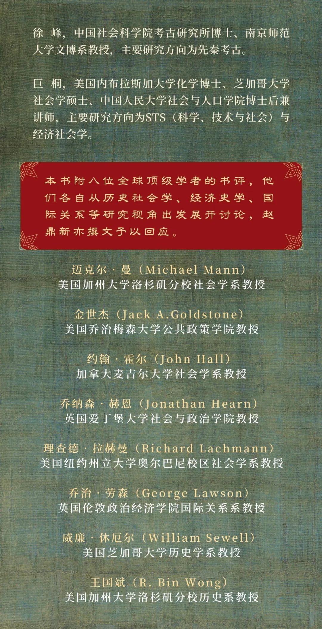 此书……不仅对我们理解一个世界伟大文明的长时段历史发展做出了根本性贡献,而且还加深了我们对普遍的历史动态与历史结构的理解。我将之视为世界史研究与历史社会学的当代经典,它与诸如马克斯·韦伯(Max Weber)、费尔南·布罗代尔(Fernand Braudel)、马克·布洛赫(Marc Bloch)、巴林顿·摩尔(Barrington Moore)、威廉·麦克尼尔(William McNeill)、查尔斯·梯利(Charles Tilly)和迈克尔·曼(Michael Mann)等学者的作品属于同一行列。