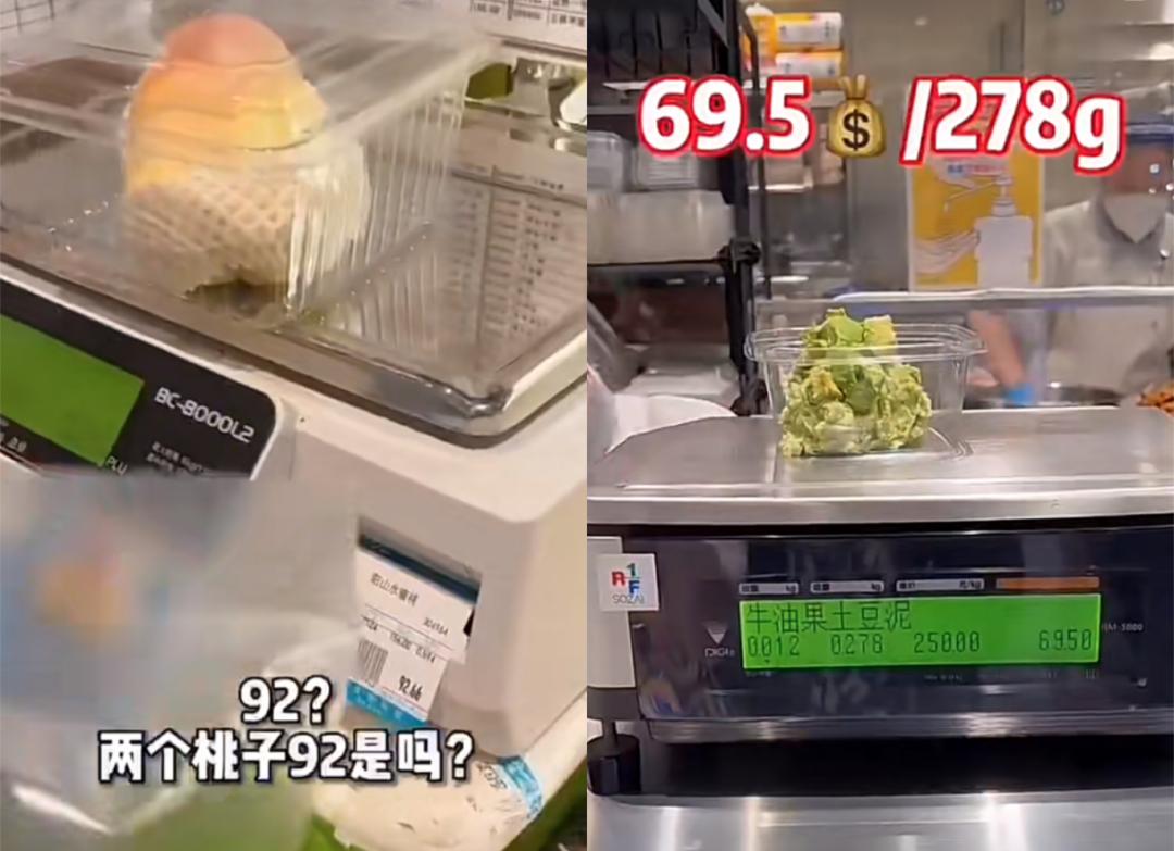前几日,一段在网络上传播度很广的视频中显示,一女子在逛商场时,挑了两个水蜜桃,直接被称重后的价格吓到,居然要92元。她刚开始还以为自己听错了,于是就向服务员确认“两个桃子92块是吗?”在得到肯定的答复之后,她赶紧叫店员少拿一个,硬着头皮支付了48元。随后她又逛到商场的沙拉轻食店,要了一小份牛油果沙拉,结果称出了69.5元,直言“吃不起”。