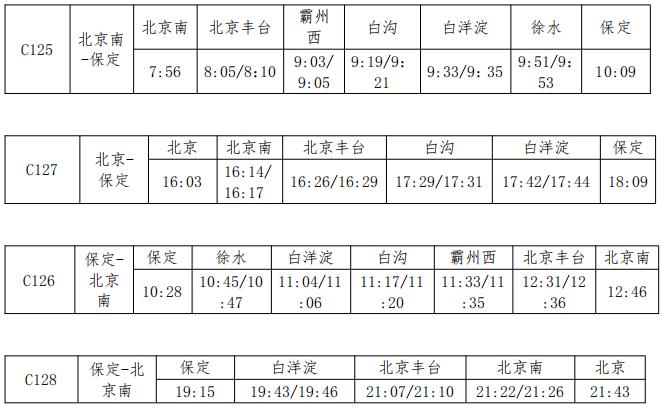 北京(南)至保定C125、C126、C127、C128次列车时刻表如下: