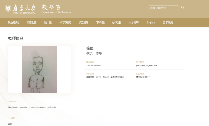 在南京大学数学系官网的教师信息栏目中,喻良教授的头像是一张手绘的个人肖像。