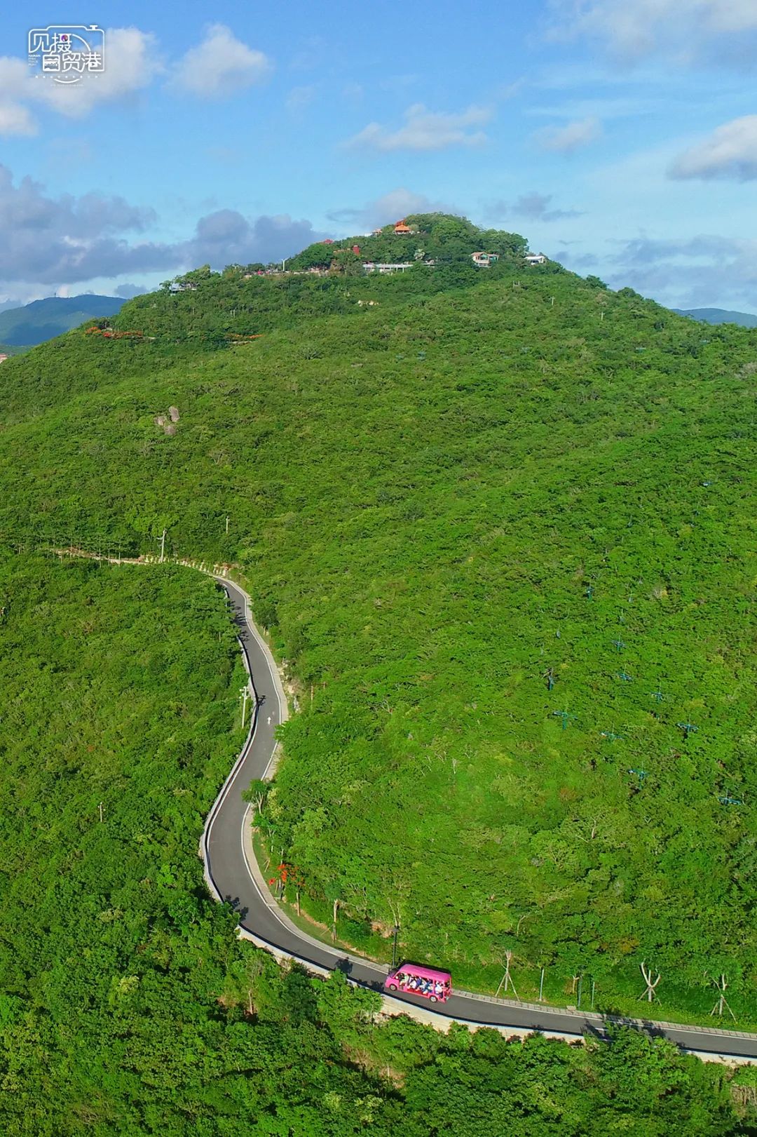 7月12日,俯瞰三亚市鹿回头景区,一辆观光车辆载着游客在景区公路上穿梭,欣赏周边风景。见习记者 王程龙 摄