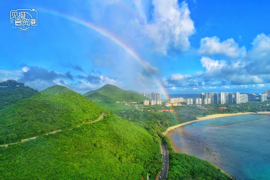 7月11日下午,远眺三亚鹿回头景区,一道彩虹出现,为海岸线增添一道别样风景线。见习记者 王程龙 摄