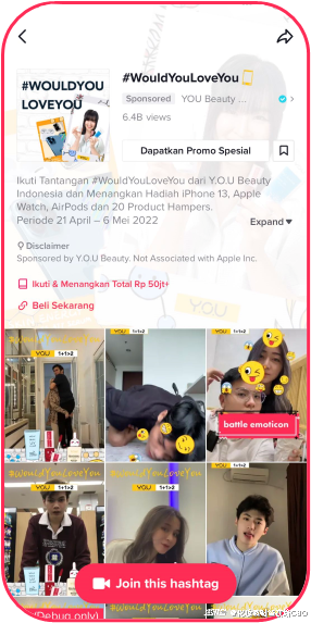 遵循着这一准则,Y.O.U通过Tik Tok去了解印尼最火的趋势是什么,受关注的热点是什么,再基于分析和理解去制定能打动人心的营销方案,并且和Tik Tok 合作产出一些创意内容,并将广大用户纳入到内容互动中,最终达到寻找客户,扩大市场的目的。