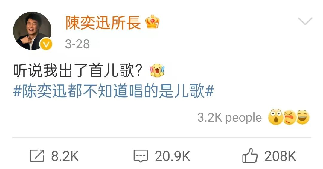 这首歌在小朋友圈当中的火爆程度,连歌手陈奕迅本人都始料未及。他在微博发文调侃问道:“听说我出了首儿歌?”
