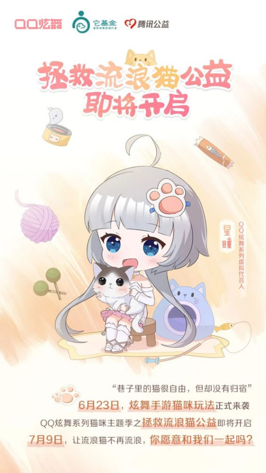 流浪猫,就像每个城镇的伤痕,应该被关爱。在QQ炫舞猫咪主题季来临之际,它基金与QQ炫舞系列、腾讯公益一起即将开启流浪猫公益企划。本次公益企划,QQ炫舞系列将结合游戏内猫咪玩法及猫咪相关运营活动,通过腾讯公益为流浪猫提供粮食及绝育服务。