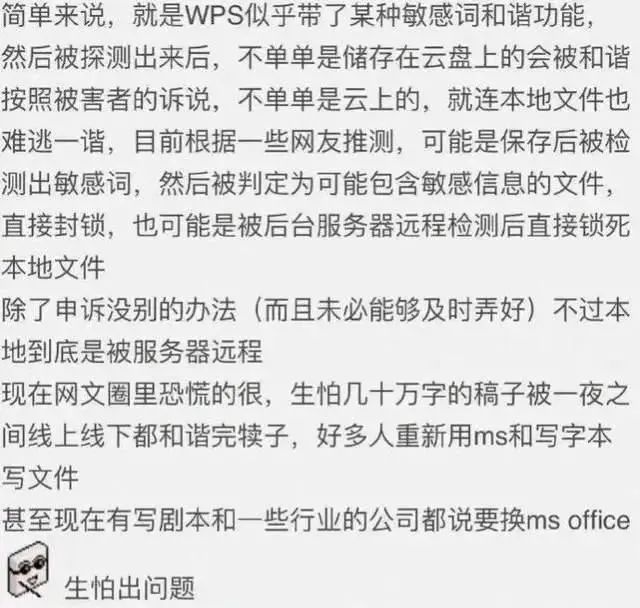 7月11日午间,有网友称其在WPS上写了一百多万字的小说文稿,云文件已无法打开,小说对应的本地文件也无法用WPS打开,但可以用其他办公软件打开。WPS提醒称,“文件含有违禁内容,禁止访问”。此外该网友称,“WPS客服告诉我是因为分享导致触发了敏感词。而我除了前一万(晚)分享给编辑之外,没有再分享过,唯一一次分享是给WPS客服。”