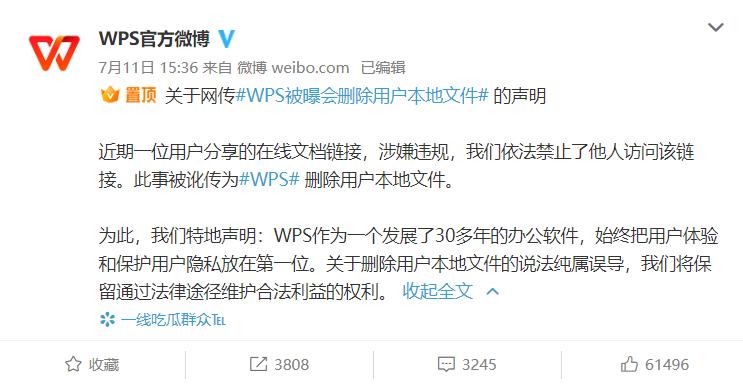 近期一位用户分享的在线文档链接,涉嫌违规,我们依法禁止了他人访问该链接。此事被讹传为#WPS#删除用户本地文件。为此,我们特地声明:WPS作为一个发展了30多年的办公软件,始终把用户体验和保护用户隐私放在第一位。关于删除用户本地文件的说法纯属误导,我们将保留通过法律途径维护合法利益的权利。”