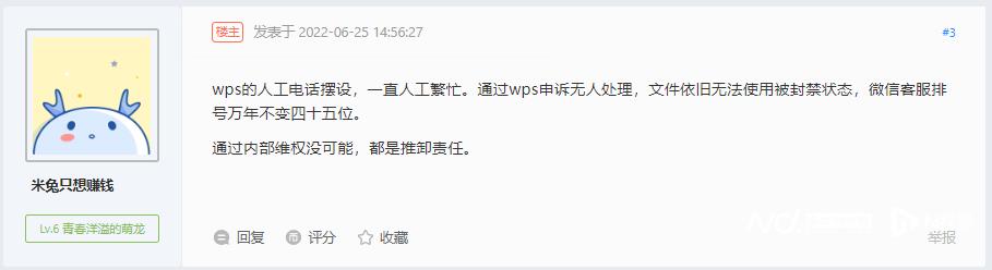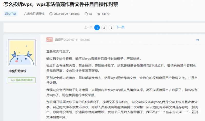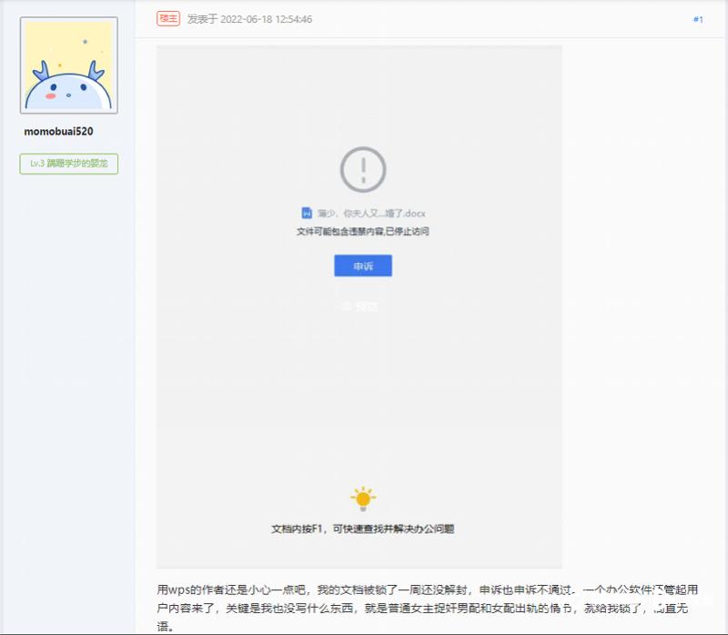6月18日,同一论坛内的另一名网友也发文称遇到相同的WPS封禁事件,该网友称自己在WPS写小说的云文件被封禁了一周仍无法打开,申诉无法取得有效进展。