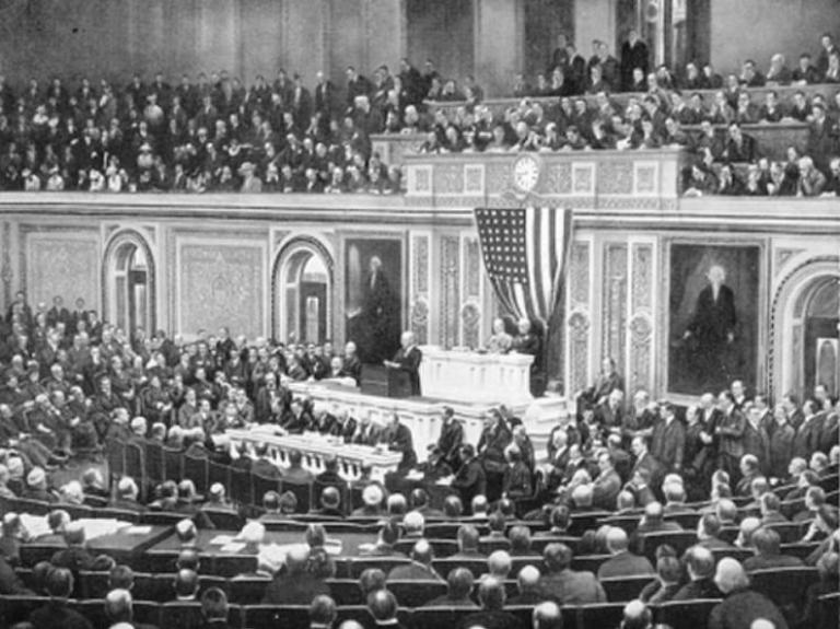 4月2日,威尔逊来到国会,要求国会正式接受“被迫成为交战国的身份”。他说,当“独裁政府拥有武力,由自身意志而非人民意志操纵武力”,危及世界和平和世界人民的自由时,“中立不再可行,也不再被渴求”。