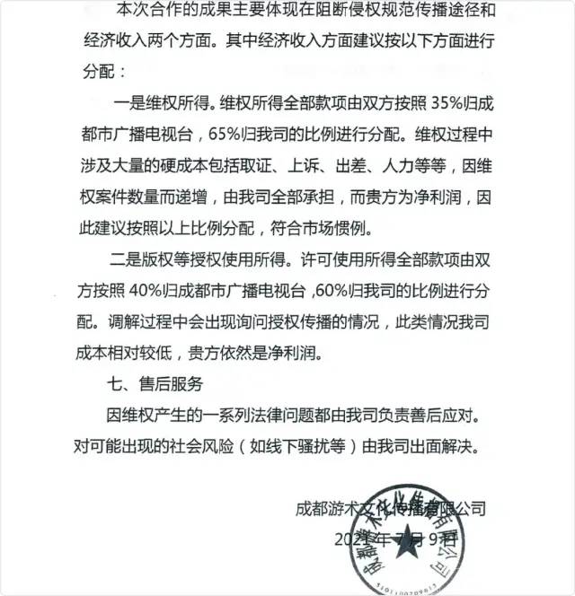 而关于双方的合作分成,《策划方案》显示,对于版权维权所得的部分,全部款项由双方按照“35%归成都市广播电视台,65%归成都游术”的比例进行分配,并且,维权过程中成本由成都游术全部承担。