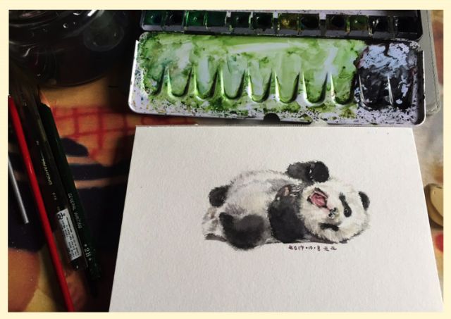 水彩画的题材很广泛,一般来说风景画比较多。我喜欢画动物,只会偶尔画画风景,画的风景还全是阴天,很多人不喜欢的……选择画什么题材和自己当时的心情、境遇是分不开的。如果一开始就给你一些课程,可能是很简单的一个苹果、一株植物,按照步骤一点点画应该可以画好的。我不喜欢这样,如果真的想当成一个长期的爱好,想每天主动地学习,还是要先找到自己感兴趣的。风景、植物、动物、人像,又或者更详细的星空、花、猫,挑一种自己喜欢的。目前我在画熊猫,熊猫真的是很萌的动物,即使我不画它,我平时也很喜欢看熊猫卖萌的照片或者视频。选一个平时你就关注或者脑袋里一直有印象的领域,开始自己的绘画生活。