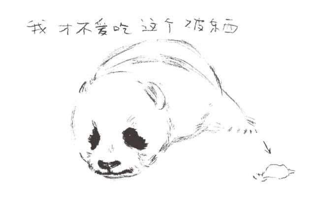 我们先画一只熊猫,怎么样?是几个圆球组成吧。这张画的是小灰灰本来在睡觉,忽然被坏游客扔无花果砸醒了的瞬间。目前我已经画了差不多三十只熊猫了,我发现每只熊猫真的长得是不一样的,像小灰灰就长得很好看,这就是偏爱,题材就是要找偏爱的。
