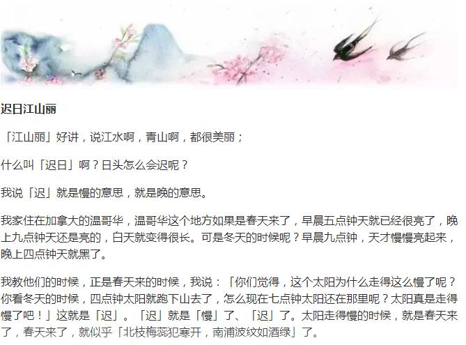 想起给娃诗词启蒙,是因为读到了叶嘉莹给幼儿园小朋友们讲杜甫的《绝句》,“迟日江山丽,春风花草香。泥融飞燕子,沙暖睡鸳鸯”。深入浅出,用小孩子们都能听得懂的语言讲述四季更迭。