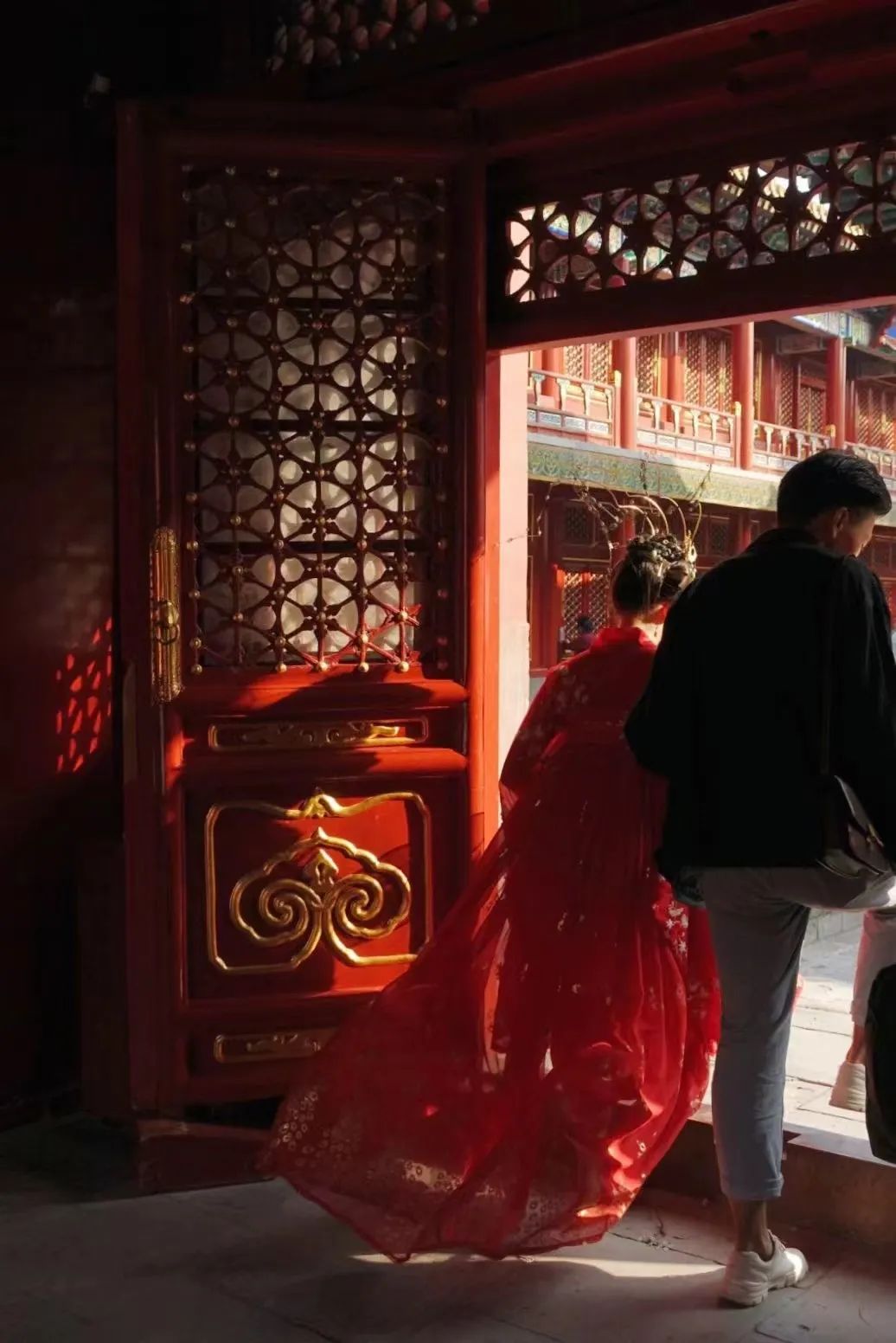 在北京故宫,本来想拍阳光与雕花扇门的光影,无意中拍到了这张照片。一开始觉得不符合自己的想法,构图也一般,好像只能作废,但之后再看,又觉得这样也有点意思。