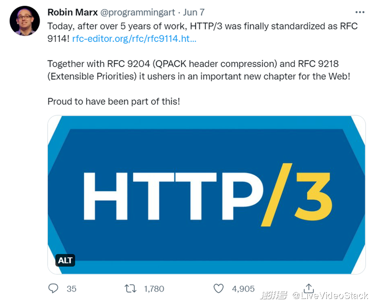 6 月 7 日,IETF 贡献者、HTTP/3 和 QUIC 工作组成员 Robin Marx 在推特上宣布:“历时五年,HTTP/3 终于被标准化为 RFC 9114!”