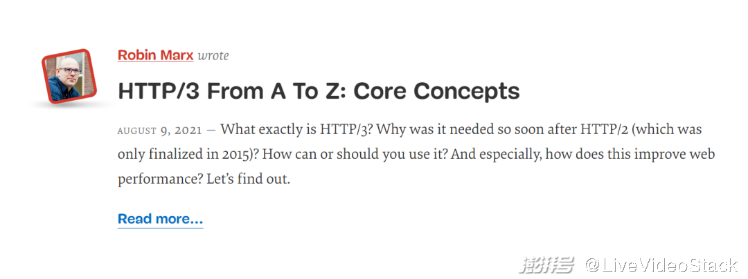 为了更好地理解这一新发布的标准,LiveVideoStack 邀请了 Robin Marx 加入我们的访谈,请他来跟大家详细聊聊 HTTP/3。
