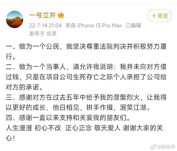 14日晚,李亚鹏在个人微博回应:“做为一个公民,我坚决尊重法院判决并积极努力履行。”他表示,“我并未向对方借过钱,只是在项目公司生死存亡之际个人承担了公司给对方的承诺。”