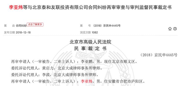 上述争议,应当也是北京市高院裁定再审此案的原因之一。法院根据案情材料和双方提交的证据,最终判决李亚鹏和其兄李亚炜向北京泰和友联公司支付4000万元及利息。
