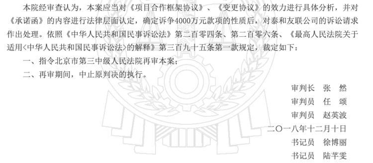 因不服该判决,李亚鹏、李亚炜于2018年3月提起上诉,二审维持原判。李亚鹏、李亚炜向北京市高级人民法院申请再审,北京高院于2018年12月10日作出(2018)京民申4445号民事裁定,指令北京三中院再审本案。北京市高级人民法院审查认为,应当对《承诺函》的内容进行法律层面认定,确定诉争4000万元款项的性质后,对泰和友联公司的诉讼请求作出处理。