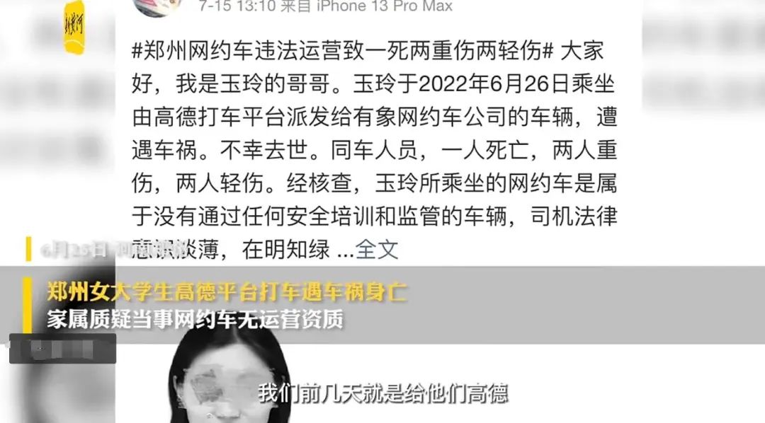 据新黄河客户端报道,6月26日,郑州一女大学生苏玉玲和朋友在郑州乘坐由高德打车平台派发给“有象约车”的网约车时遭遇车祸,不幸去世,同车人员还有两人重伤,两人轻伤。