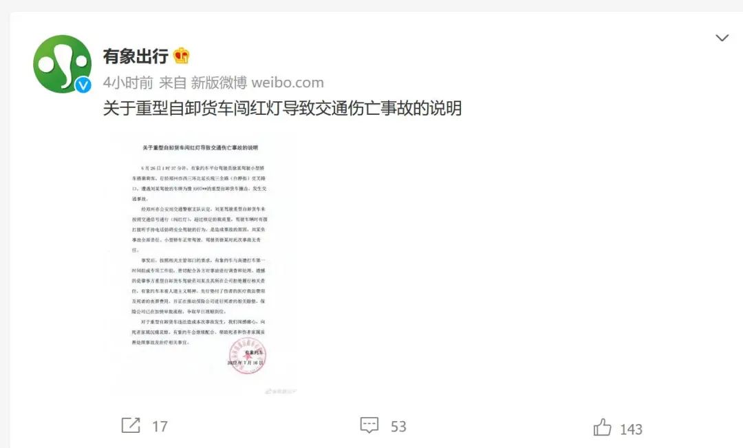 值得注意的是,在这份说明中,有象出行认为驾驶员徐某对此次事故无责任。有象出行表示,经郑州市公安局交通警察支队认定,刘某驾驶重型自卸货车未按照交通信号通行(闯红灯),超过核定的载质量,驾驶车辆时有拨打接听手持电话妨碍安全驾驶的行为,是造成事故的原因,刘某负事故全部责任。小型轿车正常驾驶,驾驶员徐某对此次事故无责任。