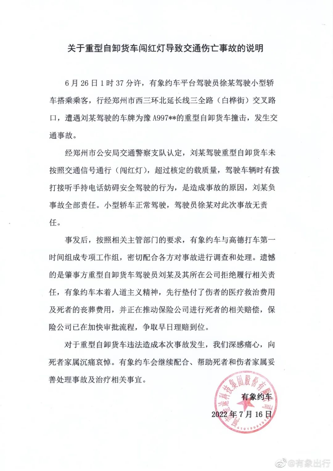 6月26日1时37分许,网约车平台有象约车注册驾驶员徐某,驾驶小型轿车搭乘乘客,行经郑州市西三环北延长线三全路(白桦街)交叉路口时,遭遇重型自卸货车撞击,发生交通事故。重型自卸货车驾驶员为刘某,车牌号为豫A997*。对于此次乘客乘坐网约车遭遇交通事故,并造成乘客伤亡,高德打车对此深感痛心,并向死者家属沉痛哀悼。事件发生后,高德打车第一时间进行了相关调查和跟进处理。声明中还提到,经交警支队认定,重型自卸货车负事故全部责任。在肇事方重型货车拒绝履行相关责任的情况下,专项工作组先行垫付了伤者的医疗救治费用及死者的丧葬费用。高德打车将继续督促有象约车妥善处理事故相关事宜。高德打车会持续履行平台责任,积极推进专项工作组配合、帮助死伤者家属妥善处理事故及治疗相关事宜。
