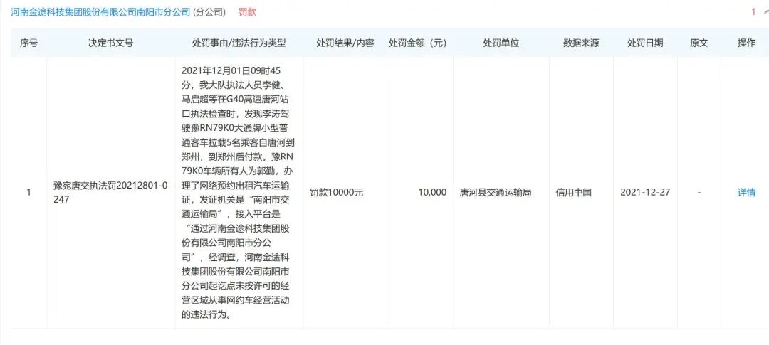 企查查信息显示,有象出行的大股东河南金途科技集团股份有限公司,曾有过交通处罚信息。2021年12月1日,河南金途科技集团股份有限公司南阳市分公司被发现,存在未按许可的经营区域从事网约车经营活动的违法行为,并处于罚款1万元。