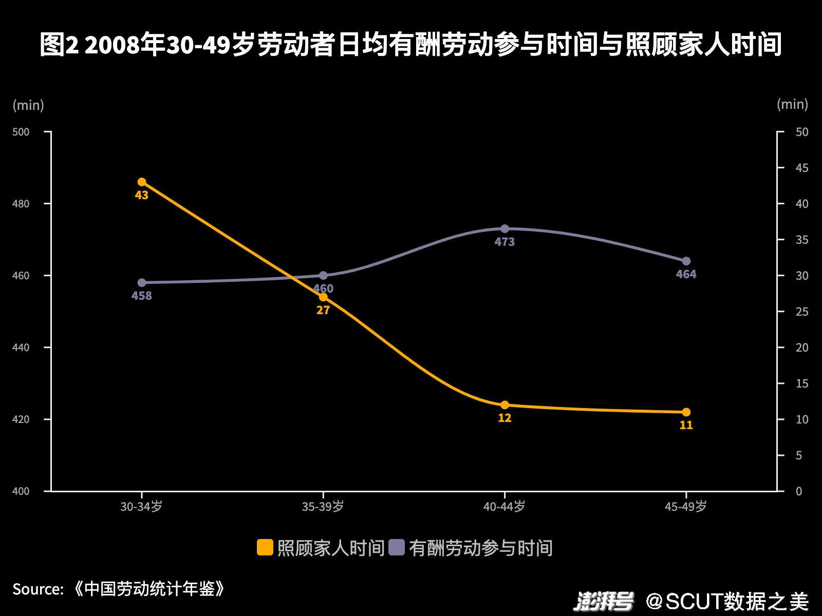 2008年,男性平均结婚年龄为24.63岁,女性平均结婚年龄为22.56岁,20-30岁成为由个人走向家庭的拐点。从数据来看,中国夫妇长期投身于有酬劳动之中,劳动时间位于世界的前列。30-49岁的中国女性有酬劳动时间远超全球平均标准,在联合国统计的47个主要国家女性有酬劳动时间排名中位列第一。