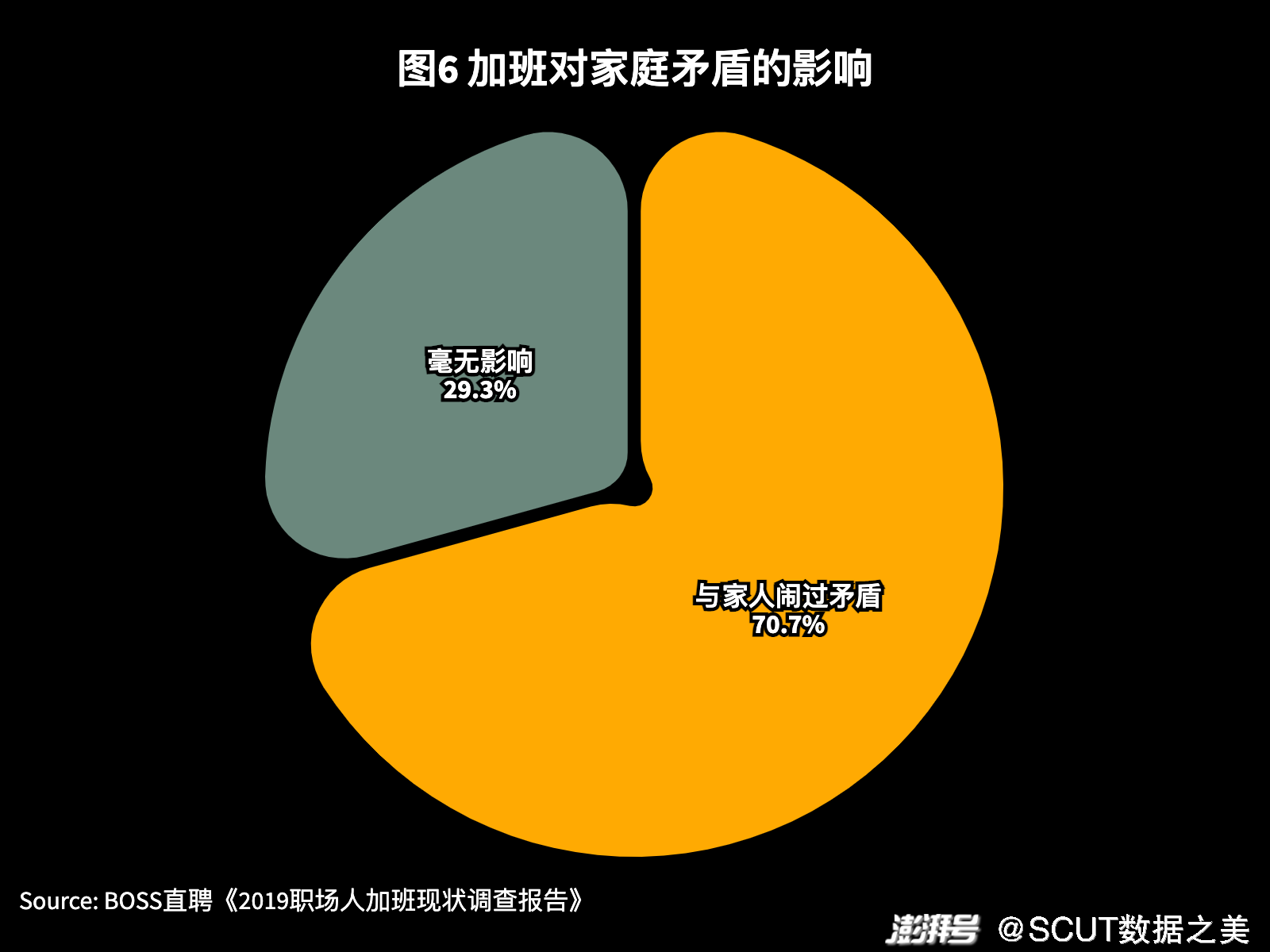 工作的压力与焦虑如果被带回家庭,将会加剧夫妻之间的矛盾。70.7%的职场青年表示因为加班与家人闹过矛盾,只有不足30%的人认为加班对家庭关系毫无影响。