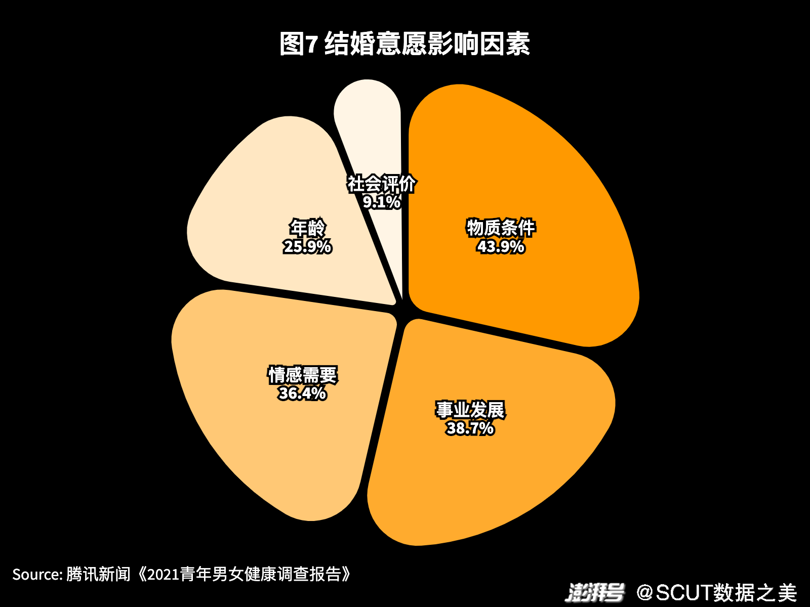 《2021青年男女健康调查报告》显示,物质条件和事业发展已经成为了影响结婚意愿的两大最重要因素,二者占比超80%。这意味着中国人必须在工作中投入更多时间,获得更多的收入,追求更高的职位,以完成步入婚姻的筹备。