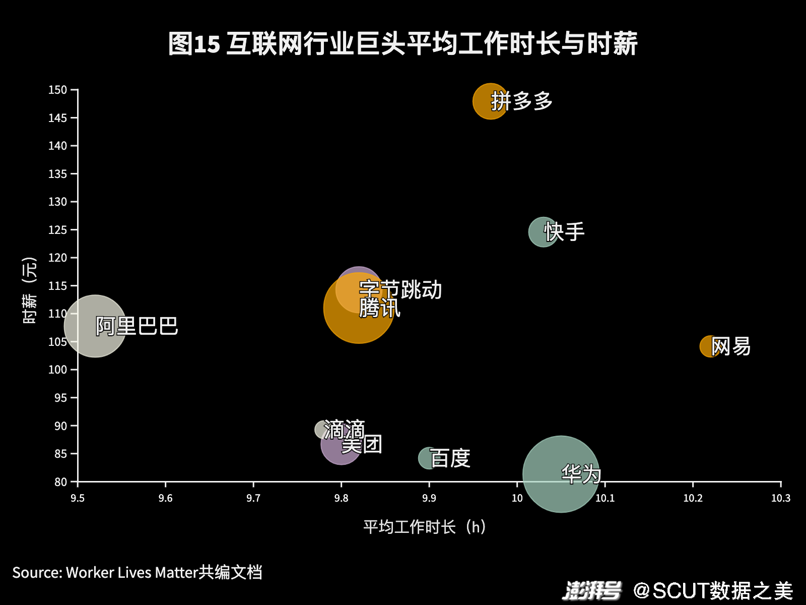 据2021年9月15日国家统计局发布的数据,全国企业就业人员周平均工作时间为47.5小时。如果假设互联网企业一周上班五天,则互联网企业就业人员周平均工作时间为52.35小时,那么将会比全国企业就业人员周平均工作时间多出10.2%。事实上,互联网行业的时薪却并不像“神话”中的那般传奇,当时薪超越100元后,互联网工作的时薪与全行业相差无几。这似乎仍然印证着“时间就是金钱”的恒定真理。行业繁荣的背后,仍然是“打工人”以时间做交易、苦苦支撑的生命痕迹。
