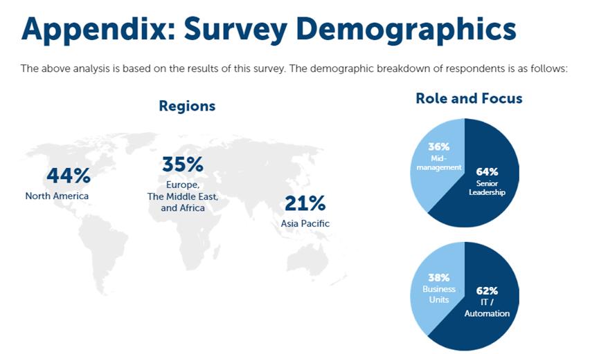 95%受访者表示,认为智能自动化是其转型战略的关键组成部分。通过集中规划自动化,组织正在将自动化深度集成到他们的数字化转型业务中。
