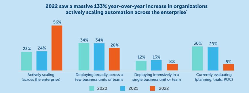 积极扩展自动化的组织数量在2021年至2022年间翻了一番多,智能自动化实施成熟度从24%增加到56%。2022年,在整个企业中积极扩展自动化的组织数量同比大幅增长133%。