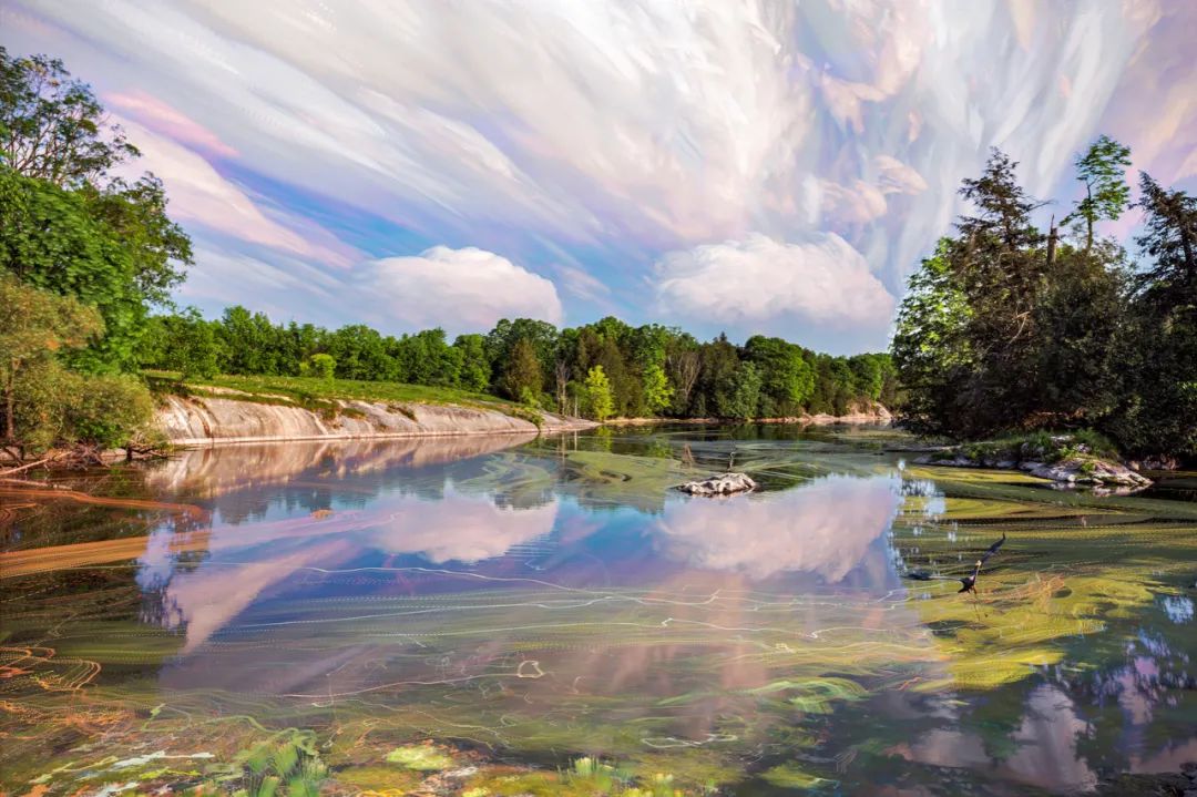 延时技术在摄影中的运用并不少见,但加拿大摄影师马特·莫洛伊(Matt Molloy)的使用方式却非常独特,他通过堆叠数百张延时照片的方法,创造出如同印象派绘画一般的风景图像。在最后堆叠合成的静态图片中,延时拍摄出的变动轨迹变成了“画作”中的多彩笔触,展现出时间、运动和光影的变化过程,绚烂变幻的天空与静态的地面景物之间形成鲜明的对比,呈现出梦幻般的超现实主义效果。