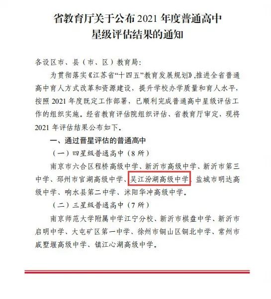 2003年7月,江苏省教育厅为贯彻落实省政府《关于加强基础教育改革与发展的意见》精神,积极培植普通高中优质教育资源,调动各方面积极性,促进高中教育均衡发展,决定在全省范围内不再验收省重点中学,而实施普通高中星级评估。星级高中一共有四个级别,四星级为最高级别。