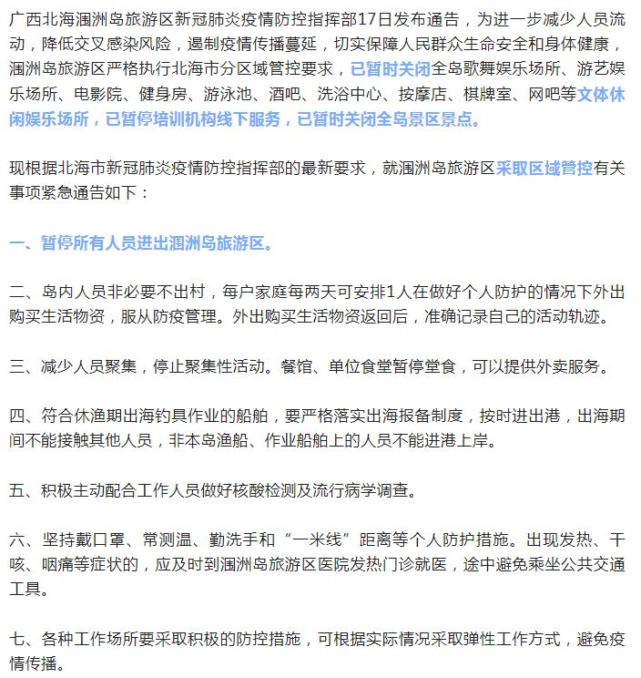 除此以外,还暂停所有人员进出涠洲岛旅游区。